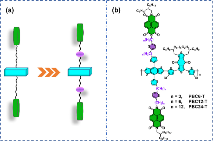 In the search for high-performance SCOSC materials, block polymers, molecular dyads, and double-cable polymers have been developed, of which double-cable polymers contain conjugated polymers as the electron-donating backbone and aromatic side units as acceptors [15–17,24,25]. For example, the incorporation of near-infrared non-fullerene acceptors as side units into double-cable polymers with an asymmetric structure has promoted the PCEs of SCOSCs to more than 10% due to enhanced photo-current generation [15]. Meanwhile, various strategies have been used to obtain well-ordered nanoscale phase separation for double-cable conjugated polymers, including rational material design (such as symmetric or asymmetric structures) and post-processing treatment [26–31]. For instance, the miscibility between the conjugated backbone and pendant acceptors can provide a large donor/acceptor interface area, particularly in the amorphous regions, which is beneficial for exciton dissociation and improves the fill factor (FF) of SCOSCs. This miscibility control has promoted the PCE to 8.4% with FF values approaching 0.7 in SCOSCs [24,32]. In addition to the conjugated donor and acceptor units, the linkers, which determine the degree of freedom of conjugated backbones and side units, are equally important, since they modulate molecular orientation and nano-scale phase separation. Our previous works have demonstrated that the length of the alkyl linkers can significantly change the morphology of thin films and it can reduce non-radiative recombination of charge carriers in SCOSCs [33–35]. However, it remains challenging to obtain materials with very long alkyl linkers due to the intrinsic low solubility of alkyl molecules longer than C20H40 which usually are waxy oils or solids, and the highly challenging synthesis.