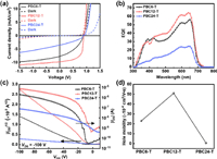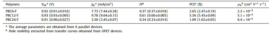 | Fig. 2. (a) J-V characteristics and (b) the corresponding EQE spectra of SCOSCs based on PBC6-T, PBC12-T and PBC24-T. (c) Typical p-type transfer curves of representative OFET devices of these polymers. (d) The μhs of these polymers calculated from the OFET measurements. | |