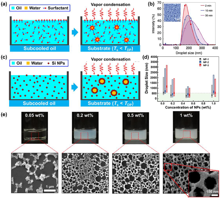 | Fig. 1. Production of NEs via vapor condensation. (a) Illustration of condensation of vapor with high humidity into a cooled oil bath containing surfactants to produce W/O NEs. (b) Condensation-time dependent change of size distribution for water nanodroplets formed by condensing vapor into dodecane with 100 mmol/L Span 80. Reproduced with permission [28]. Copyright 2017, Springer Nature. (c) Illustration of condensation of vapor with high humidity into a cooled oil bath containing NPs to produce W/O Pickering NEs. (d) Size distribution of Pickering NEs stabilized by silica NPs with sizes of 13 ± 2.1 nm (NP-1), 52 ± 4.1 nm (NP-2) and 92 ± 10.3 nm (NP-3), and with different concentrations. (e) Photographs and SEM images of Pickering NEs stabilized by different contents of NP-2. Reproduced with permission [30]. Copyright 2018, American Chemical Society. | |