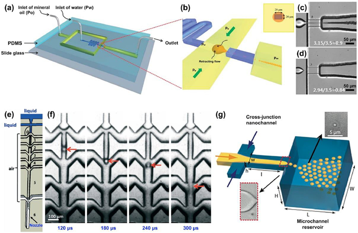 | Fig. 5. Micro-/nano-fluidic techniques for controllable production of NEs. Illustration of microfluidic device (a) for continuous production of uniform NEs in a tip-streaming mode (b). High-speed snapshots of droplet breakup in dripping (c) and tip-streaming (d) mode with different pressure ratios. Reproduced with permission [57]. Copyright 2012, Royal Society of Chemistry. Illustration of the supersonic microfluidic spray-drying device (e) and time-lapse high-speed snapshots showing the droplet breakup in the device (f). Reproduced with permission [55]. Copyright 2017, Royal Society of Chemistry. (g) Illustration of micro-/nano-fluidic device with cross-junction nanochannel and microchannel reservoir for controllable production of NEs. Reproduced with permission [60]. Copyright 2010, American Chemical Society. | |