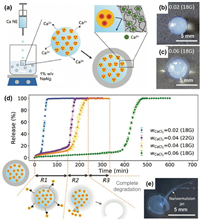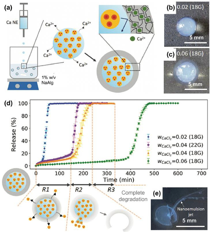 | Fig. 7. NEs-incorporated milliparticles for controlled drug release. Illustration of dripping-based formation of alginate millicapsules containing ibuprofen-loaded NEs (a), with controlled capsule size and shell thickness (b, c). Release of ibuprofen from NEs-incorporated millicapsules (d) via diffusion-based sustained release (R1), burst release (R2) (e), and final post-release (R3). Reproduced with permission [83]. Copyright 2020, Wiley-VCH. | |