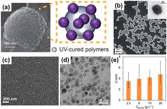 | Fig. 8. Functional NPs created from nanoemulsion templates. (a) SEM image of a NOA89 nanoparticle decorated with silica NPs, using nanodroplets from bubble-bursting. Reproduced with permission [39]. Copyright 2016, Wiley-VCH. (b) SEM image of PEGDA NPs and TEM image of magnetic PEGDA NPs (inset) prepared using nanodroplets from microfluidic flow-focusing. Reproduced with permission [57]. Copyright 2012, Royal Society of Chemistry. (c) SEM image of CaCO3 NPs prepared using nanodroplets from supersonic microfluidic spray-drying. Reproduced with permission [55]. Copyright 2017, Royal Society of Chemistry. TEM image of PLGA NPs (d) fabricated using spontaneous confined nanoemulsification, and their change of size (e) dependent on PLGA concentration. Reproduced with permission [38]. Copyright 2023, Wiley-VCH. | |