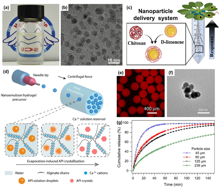 | Fig. 9. Functional NPs from NEs for biomedical application. Photo of an aqueous solution containing sub-10-nm CPT-loaded PLGA NPs (a) and TEM image of these NPs (b). Reproduced with permission [38]. Copyright 2023, Wiley-VCH. (c) Chitosan NPs loaded with d-limonene nanodroplets for enhancing the QDR of plants against BHNs. Reproduced with permission [111]. Copyright 2021, American Chemical Society. (d) Synthesis of fenofibrate-nanoparticle-loaded alginate microparticles using nanoemulsion-loaded droplets as templates, via Ca2+-crosslinking and evaporation-induced nanocrystallization. (e) Fluorescent micrograph of microgel particles with NEs containing Nile-red-dyed fenofibrate. (f) TEM image of the recovered fenofibrate nanocrystals from the dried microgel particles with 70.7% drug loads. (g) Cumulative release profiles of the dried microgel particles with 70.7% drug loads and different sizes. Reproduced with permission [112]. Copyright 2020, American Chemical Society. | |