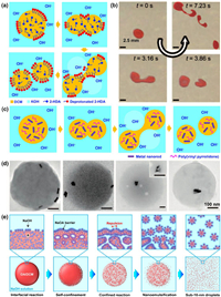 | Fig. 3. Production of NEs via interfacial-reaction-induced droplet self-division. Illustration (a) and optical micrographs (b) of interfacial-reaction-induced spontaneous division of DCM/2-HDA droplets into smaller daughter droplets in KOH solution. (c) Illustration of formation of nanoemulsion droplets encapsulated with functional nanorods via droplet self-division. (d) TEM image of the resultant nanorod-containing nanodroplets. Reproduced with permission [34]. Copyright 2010, Wiley-VCH. (e) Schematics of spontaneous confined nanoemulsification process for creating sub-10-nm uniform nanoemulsion droplets. Reproduced with permission [38]. Copyright 2023, Wiley-VCH. | |