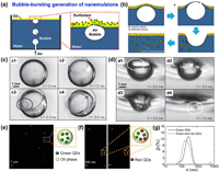 | Fig. 4. Production of NEs via bubble bursting. Illustration showing generation of floating bubbles under surfactant-containing water with a top oil layer (a) for bubble bursting (b). Reproduced with permission [39]. Copyright 2016, Wiley-VCH. High-speed snapshots showing a bubble bursting at air/oil (c) and oil/water (d) interfaces. Reproduced with permission [40]. Copyright 2014, Springer Nature. NEs containing green QDs (e), and green and red QDs (f), and their size distributions (g). Reproduced with permission [39]. Copyright 2016, Wiley-VCH. | |