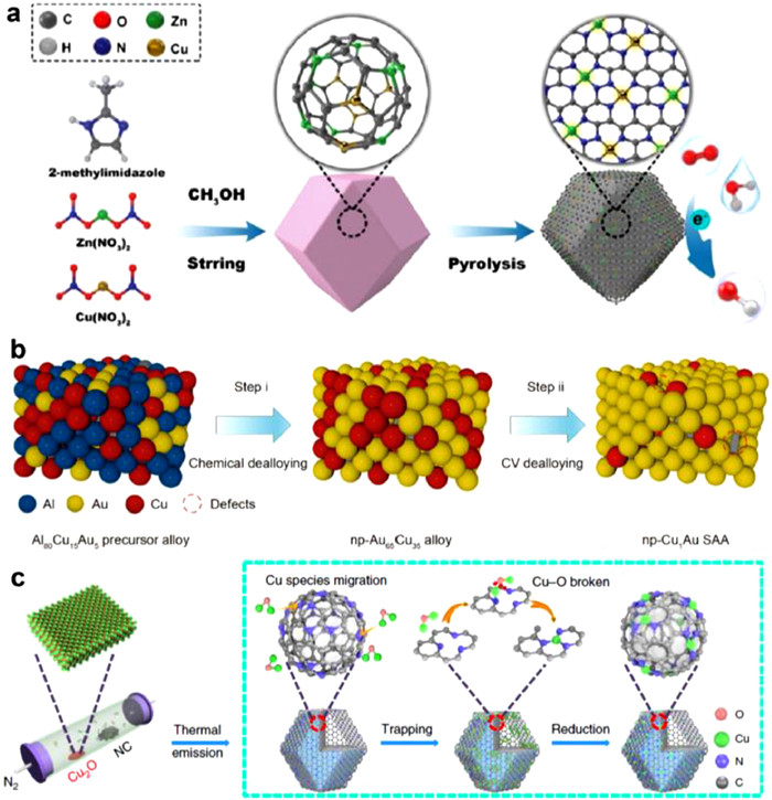 | Fig. 1. (a) Schematically showing the synthetic strategies of Cu SACs by pyrolysis method. Reproduced with permission [38]. Copyright 2019, Royal Society Chemistry. (b) Scheme for the synthesis of np-Cu1Au SAA via dealloying strategy. Reproduced with permission [39]. Copyright 2021, Springer. (c) Schematic illustration of the synthesis of Cu ISAS/NC via gas-transport strategy. Reproduced with permission [40]. Copyright 2020, Nature Publishing Group. | |