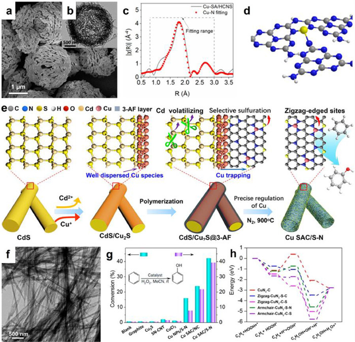 | Fig. 10. (a) SEM and (b) TEM images of the Cu-SA/HCNS. (c) The corresponding EXAFS fitting curve of Cu-SA/HCNS. (d) Model of Cu–N3 sites in Cu-SA/HCNS. Reproduced with permission [126]. Copyright 2018, American Chemical Society. (e) Scheme showing the synthetic procedures of the Cu SAC/S-N. (f) TEM image of the Cu SAC/S-N. (g) Conversion rates and yields of benzene oxidation. (h) Free energy diagram of different configurations reaction pathway. Reproduced with permission [35]. Copyright 2020, American Chemical Society. | |
