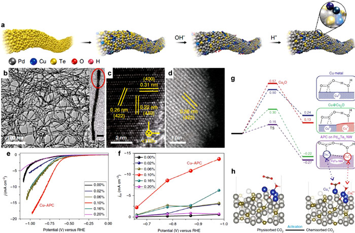 | Fig. 2. (a) Scheme of the synthesis of APC. (b) TEM and (c, d) HRTEM images of the APC. (e) LSV polarization curves of APC with different amounts of Cu doping. (f) CO current densities of APC with different amounts under different potentials. (g, h) Free energy profiles for CO2 activation mode. Reproduced with permission [53]. Copyright 2019, Nature Publishing Group. | |