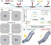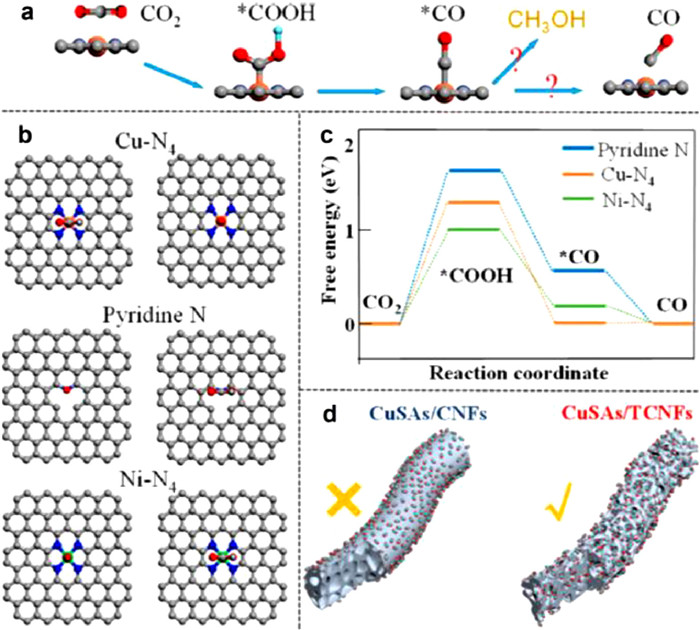 | Fig. 4. (a) Optimized atomic structures of CuSAs/TCNFs and proposed reaction paths for CO2 electroreduction. (b, c) Free energy diagram of CO2 to CO on pyridine N, Ni-N4, and Cu-N4 structure. (d) Illustration of CO2 diffusion on two samples. Reproduced with permission [56]. Copyright 2019, American Chemical Society. | |