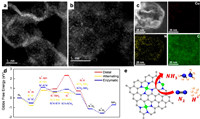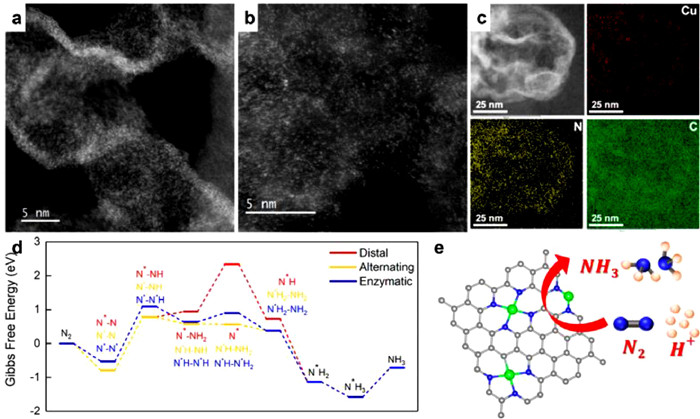 | Fig. 5. (a, b) STEM and (c) elemental mapping images of the NC-Cu SA. (d) Calculated Gibbs free energies of the NRR on Cu-N2 along the distal, alternating, and enzymatic pathways. (e) Schematically showing the NRR mechanism. Reproduced with permission [58]. Copyright 2019, American Chemical Society. | |