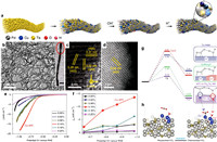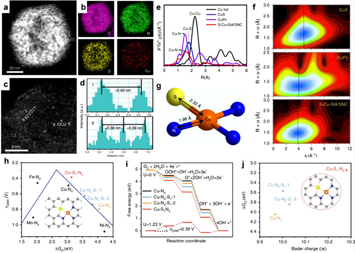 | Fig. 6. (a) STEM, (b) elemental mapping, (c) high-resolution STEM, and (d) the corresponding intensity profiles along the line X-Y in (c). (e) FT k3-weighted Cu K-edge EXAFS spectra of S-Cu-ISA/SNC and the references. (f) WT-EXAFS plots of S-Cu-ISA/SNC, CuS and CuPc. (g) Schematic atomic interface model of S-Cu-ISA/SNC. (h) ORR overpotential (ηORR) as a function of O* adsorption free energy (∆GO*) on different Cu-centered moieties. (i) Free-energy diagram for different Cu-centered moieties. (j) Relationship between the number of Bader charge of Cu and ∆GO* for different Cu-centered moieties. Reproduced with permission [88]. Copyright 2020, Nature Publishing Group. | |