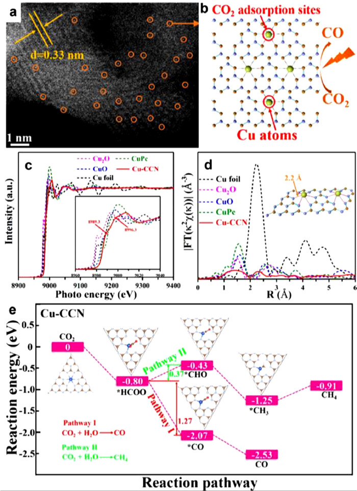 | Fig. 7. (a) AC-STEM image of the Cu-CCN. (b) Schematically showing the photocatalytic CO2 reduction based on Cu-CCN. (c) Normalized X-ray absorption near-edge structure spectra and (d) Fourier transform extended X-ray absorption fine structure spectra of the Cu-CCN, CuO, Cu2O, CuPc, and Cu foil. (e) Reaction pathways for photocatalytic CO2 reduction and the corresponding chemical molecular structure on Cu-CCN samples. Reproduced with permission [98]. Copyright 2019, American Chemical Society. | |