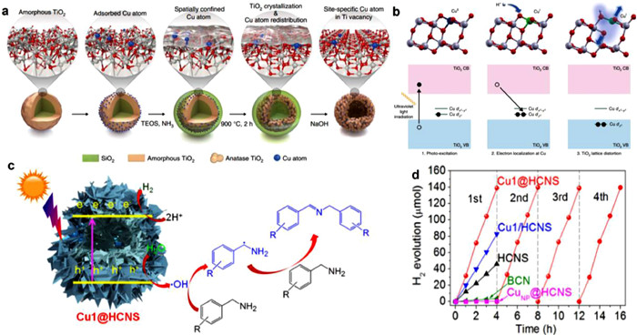 | Fig. 8. (a) Schematically showing the design of a site-specific single-atom photocatalyst. (b) Schemes of the photo-excitation process. (c) Plausible reaction mechanism over Cu1@HCNS for nonoxygen coupling of amines to imines by water under visible light irradiation. (d) Time-dependent H2 evolution over the 3 wt% Pt-deposited samples under visible light irradiation. Reproduced with permission [105]. Copyright 2020, Nature Publishing Group. | |