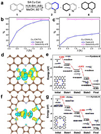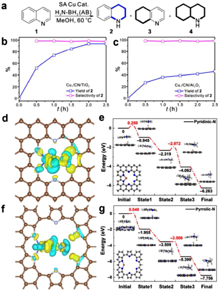 | Fig. 9. (a) Mechanism for the hydrogenation of quinoline. (b, c) Kinetic studies of transfer hydrogenation of quinoline with Cu1/CN/TiO2. The differential charge density of AB molecule absorbed on SA Cu species coordinated with (d) pyridinic-N and (e) pyrrolic-N. Hydrogenation process on the coordination of (f) pyridinic-N and (g) pyrrolic-N. Reproduced with permission [116]. Copyright 2020, Springer. | |