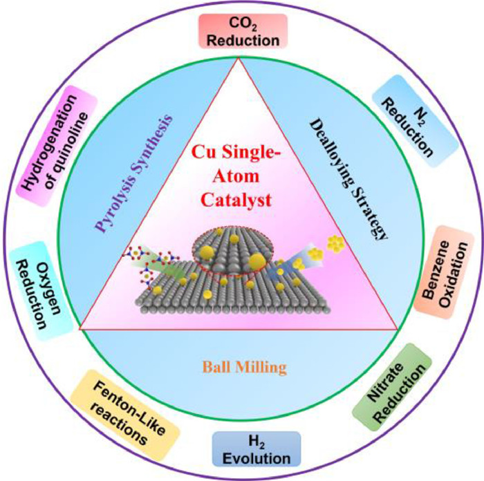Inspired by this, we provide here an overview regarding the recent progress of Cu SACs in the field of catalytic reactions (Scheme 1). We first illustrate a detailed discussion about the synthesis of advanced Cu SACs, and then some representative examples for the electrocatalytic reactions, photocatalytic reactions, and heterogeneous reactions are also summarized and compared. We also provide the theoretical insights into the coordination environment and free energy diagram analysis, which is beneficial to understand the relationship between the properties and local atomic structure, revealing reaction mechanism and guiding experiments. Finally, the challenging issues and perspective insights are presented, providing an outlook for future research.