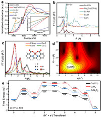 | Fig. 3. (a) X-ray absorption near-edge structure (XANES) spectra and (b) Fourier transform (FT) EXAFS spectra at the Cu K-edge of different samples. (c) EXAFS fitting curves of Cu-CDs in R space using backscattering paths of Cu-N, Cu-O, and Cu-C. (d) Wavelet transform (WT) of Cu-CDs. (e) Free energy diagram of the CO2 reduction pathway to CH4 on the different catalysts. Reproduced with permission [54]. Copyright 2021, Nature Publishing Group. | |
