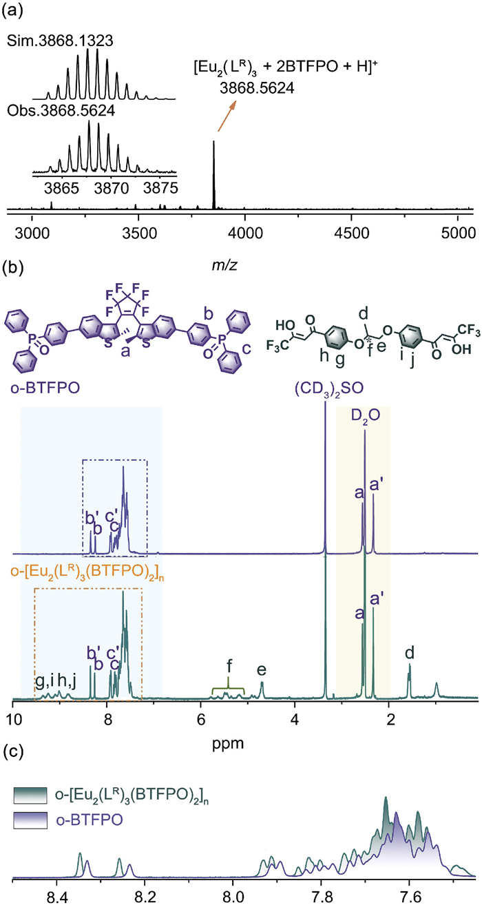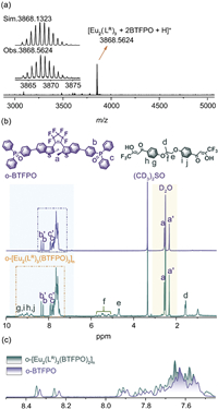 | Fig. 1. (a) ESI-MS spectrum of [Eu2(LR)3(BTFPO)2]n with the inset representing the simulated (Sim.) and observed (Obs.) isotopic distributions. (b) 1H NMR spectra (400 MHz) of o-BTFPO (purple line), and the polymer o-[Eu2(LR)3(BTFPO)2]n (olive line) in DMSO‑d6. (c) The overlapped 1H NMR spectra of o-BTFPO (purple line) and o-[Eu2(LR)3(BTFPO)2]n (olive line) in DMSO‑d6. | |