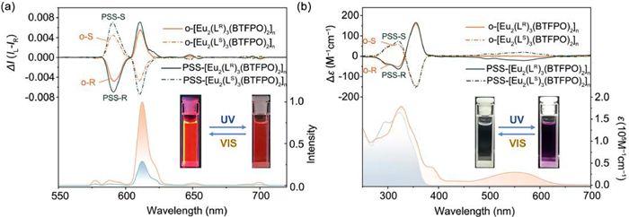 | Fig. 2. (a) UV−vis absorption (lower curve, right axis) and CD spectra (upper curves, left axis). (b) PL (lower curve, right axis) and CPL spectra (upper curves, left axis) [Eu2(LR)3(BTFPO)2]n and [[Eu2(LS)3(BTFPO)2]n in the open-ring and photostationary states (c = 1 × 10−5 mol/L, THF). | |