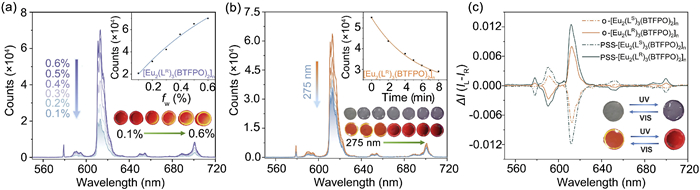 | Fig. 3. (a) Emission spectra of hybrid films with doping levels of 0.1%−0.6%. (b) Emission spectra of hybrid films with doping levels of 0.6% after exposure to 275 nm UV with 1.0 min interval time. (c) CPL spectra comprised of polymer film with the open-ring and photostationary states (doping amount = 0.6%). | |