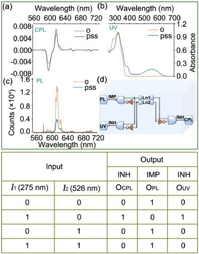Because of the same variation tendency of UV and CD spectra, their logic relationships are also the same. Thus, here we selected the UV signal as one logic output, and named as OUV. The logic outputs of "0" and "1" of OUV are defined by monitoring the absorbance at 551 nm (A > 0, OUV = 1; A = 0, OUV = 0). In the case of PL (OPL) and CPL (OCPL) as output signals, the emission intensity in photostationary state (λem = 611 nm) of PL and the initial glum value of CPL (λem = 591 nm) are defined as "0", while their corresponding increases are defined as logic output "1". With these logic relationships and the corresponding definitions, two kinds of logic gates named INHIBIT and IMPLICATION based on OUV, OPL and OCPL are fabricated as shown in Fig. 4.