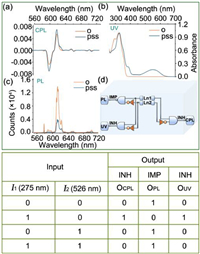 | Fig. 4. The symbolic representation and truth table of the logic circuit. The two trigger wavelengths are denoted as input, I1 (275 nm) and I2 (526 nm). The output is defined as OCPL (CPL signal at 591 nm) (a), OUV (UV signal at 551 nm) (b), OPL (PL signal at 611 nm) (c) and logic circuit (d). | |