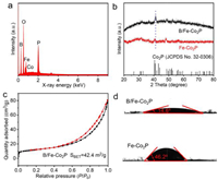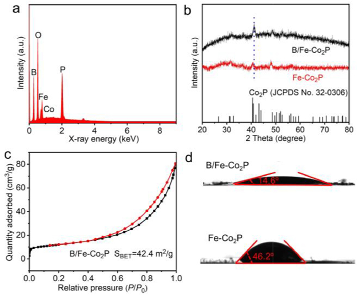 | Fig. 1. (a) EDX spectrum, (b) XRD pattern, and (c) nitrogen adsorption-desorption isotherm of B/Fe-Co2P HNCs, (d) the contact angle of B/Fe-Co2P HNCs and Fe-Co2P HNCs. | |