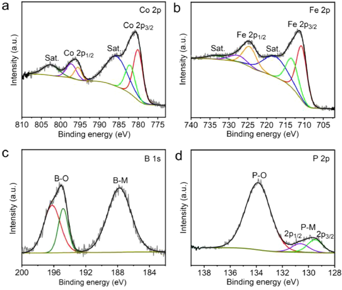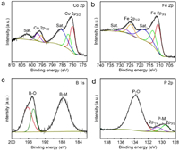 | Fig. 3. (a) Co 2p, (b) Fe 2p, (c) B 1s, and (d) P 2p XPS spectra of B/Fe-Co2P HNCs. | |