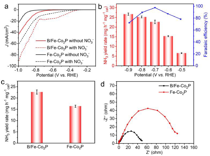| Fig. 4. (a) LSV curves of B/Fe-Co2P HNCs and Fe-Co2P HNCs in 0.5 mol/L Na2SO4 with and without 50 mmol/L NaNO3 at 5 mV/s. (b) Faradaic efficiency and NH3 yield rate of NO3–RR at B/Fe-Co2P HNCs at different potentials. (c) the NH3 yield rates of NO3–RR at B/Fe-Co2P HNCs and Fe-Co2P HNCs. (d) Nyquist plots of B/Fe-Co2P HNCs and Fe-Co2P HNCs. | |