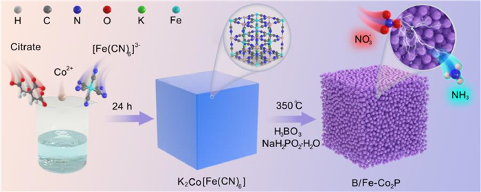 In this work, we successfully synthesized B and Fe co-doped Co2P hollow nanocubes (B/Fe-Co2P HNCs) and further investigated the NO3–RR performance. The introduction of electron-deficient B atoms could efficiently rearrange the electronic structure of Fe-Co2P HNCs. Besides, the hollow and porous architecture could provide high surface area, abundant active sites and available mass transfer pathways. Benefiting from the hollow nanostructures, well-defined void space, and tunable chemical compositions, B/Fe-Co2P HNCs exhibited an outstanding selectivity, activity, stability for the NO3– to NH3 conversion in neutral Na2SO4 electrolyte. B/Fe-Co2P HNCs with long-term stability and high activity provide a facile strategy for synthesis NH3 and elimination of NO3− contamination.