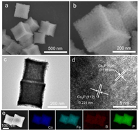 | Fig. 2. (a, b) SEM images, (c) TEM image, (d) high-resolution TEM image, and (e) EDX elemental mapping images of B/Fe-Co2P HNCs. | |