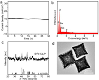 | Fig. 5. (a) Chronoamperometric curve of B/Fe-Co2P HNCs in 0.5 mol/L Na2SO4 + 0.05 mol/L NaNO3 electrolyte at −0.70 V potential. (b) EDX spectrum, (c) XRD pattern, and (d) TEM image of B/Fe-Co2P HNCs after chronoamperometry test. | |