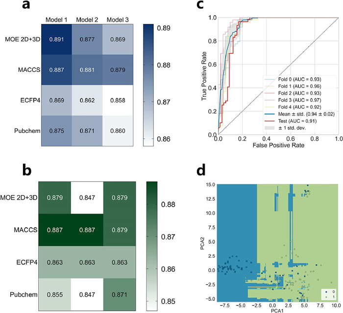 | Fig. 1. The constructed ML models for APN inhibitor prediction. (a) The heatmaps of top 3 algorithms with the best performance among different characterization methods in 5-fold CV. Models 1 to 3 respectively represent the different algorithms based on MOE 2D+3D (ET, XGBoost, RF), ECFP4 (GBT, CatBoost, RF) and Pubchem (LightGBM, CatBoost, RF). (b) The heatmaps of top 3 algorithms with the best performance among different characterization methods in the test set. Model 1 to 3 represent the same algorithms as a. (c) Receiver operating characteristic (ROC) curve for CV and test of MACCS-LightGBM model. The AUC of the ROC curve was 0.94 ± 0.02 in 5-fold CV and 0.91 in the test set. (d) Decision boundary of MACCS-LightGBM model. The feature information was compressed into two principal components, and the prediction category was obtained by predicting the coordinates of each small grid. Scatter is the real category distribution in the test set. | |