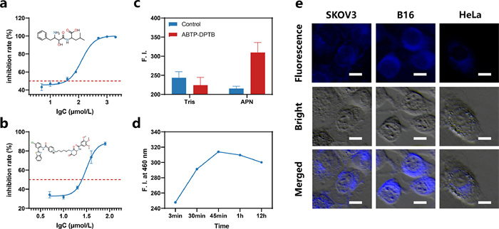 | Fig. 4. Bioactivity evaluation and fluorescence imaging of ABTP-DPTB. (a) Inhibitory effect of bestatin on APN. (b) Inhibitory effect of ABTP-DPTB on APN. (c) Fluorescence intensity changes of ABTP-DPTB in Tris and the APN solution under 460 nm. λex = 365 nm. Slit width (EX, EM): 9 nm. (d) Fluorescence intensity of ABTP-DPTB in APN at different incubation time. λex = 365 nm, λem = 460 nm. Slit width (EX, EM): 9 nm. (e) Fluorescence microscopic images of SKOV3, B16 and HeLa cells. Cells were incubated with ABTP-DPTB for 15 min. Scale bar: 10 µm. | |