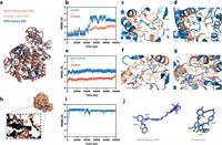 | Fig. 3. Molecular dynamics simulations results. (a) The averaged complexed structures of APN-ABTP-DPTB (after MD, lightpink) and APN-bestatin (after MD, wheat) which were aligned to the APN without MD simulations (before MD, blue). (b, e) RMSD of the ligand, receptor and complex. (c) Hydrogen bonds between bestatin and APN before MD. (d) The binding mode between bestatin and APN after MD. (f) The binding mode between ABTP-DPTB and APN before MD. (g) The binding mode between ABTP-DPTB and APN after MD. (h) The surface map of APN and the cross-sectional view of pipe D4 combined with ABTP-DPTB after MD equilibrium. (i) RMSD fluctuations of ABTP-DPTB in the aqueous solution. (j) Conformational differences between APN-bound (purple) and free states (blue) of ABTP-DPTB. | |