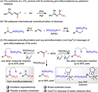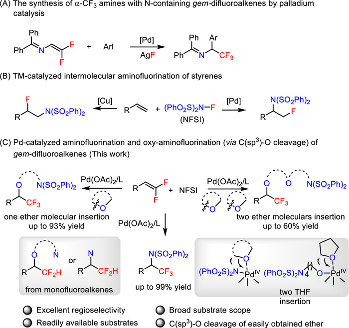 On the other hand, the aminofluorination of simple olefins with transition metal catalysis is a powerful strategy for the synthesis of fluorine-containing amines [44-52]. Liu group developed pioneer and attractive palladium-catalyzed aminofluorination of simple styrenes [53]. The more steric hindrance trifluoromethyl products and the cleavage of C(sp3)–O bond by high valent Pd species has not been discovered. Later, Zhang group developed the radical aminofluorination by copper catalysis with regioselectivities opposite to that of palladium catalysis (Scheme 1B) [54]. Inspired by these remarkable works and our continuous interest in the synthesis of α-fluoroalkyl containing compounds, herein, we report the palladium catalyzed aminofluorination and multi components oxy-aminofluorination of gem-difluoroalkenes with N-fluorobenzenesulfonimide (NFSI), which was used as the nitrogen source as well as the oxidant, affording various functional α-CF3 containing amines (Scheme 1C). Noteworthy, the three components oxy-aminofluorination reaction involved the cleavage of C(sp3)–O bonds in easily available alkyl ethers (such as THF, dioxane, DME), providing the α-CF3 benzylic ethers bearing terminal amino groups with excellent regioselectivity. We also realized the succession C(sp3)–O bond cleavage, affording two ethers insertion products with excellent selectivity by addition of Lewis acids, which might be benefit for the coordination of ether to the Pd(Ⅳ) center. We suggested that the C(sp3)–O bond cleavage initiated by the coordination of ether to the Pd(Ⅳ) center would be one attractive strategy for the transformation of ethers [55-58]. Additionally, this reaction could access to α-CF2H containing amines from monofluoroalkenes. The challenge of this catalytic system does not just include the steric hindrance of trifluoromethyl group and β-fluorine elimination, the one pot incorporation of a fluorine, an amino and an oxy substituent with high regioselectivity is also an important synthetic challenge.