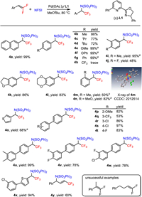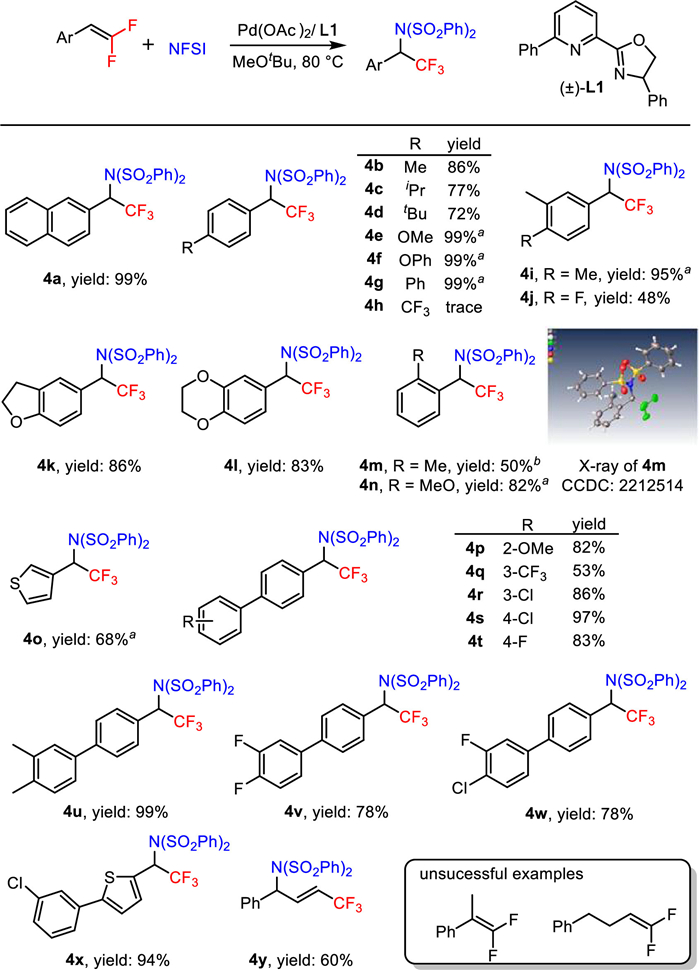 | Scheme 4. Substrate scope of aminofluorination reaction. Reaction conditions: 1 (0.20 mmol), NFSI (0.40 mmol), Pd(OAc)2 (10 mol%), L1 (10 mol%), MeOtBu (2.0 mL), 80 ℃, 24 h, isolated yields. a Pd(OAc)2 (2 mol%), L1 (2 mol%). b Pd(OAc)2 (10 mol%), L1 (10 mol%), 48 h, 120 ℃. | |