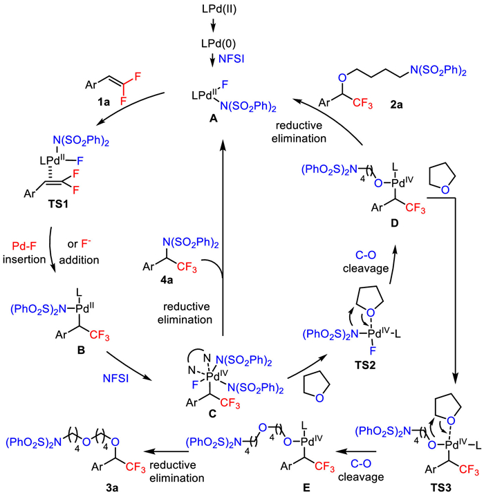 Based on these above results and previous studies in palladium-catalyzed aminofluorination of alkenes [44-52,64-72], we proposed a plausible mechanism in Scheme 7. The reaction was initiated by the generation of Pd(Ⅱ) intermediate A. After the coordination of gem-difluoroalkene 1a to the Pd(Ⅱ)–F species (TS1), Pd(Ⅱ)–F inserted or F−nucleophilic addition to the 1a and formed the intermediate B, which would undergo oxidative addition of intermediate B to NFSI and gave the Pd(Ⅳ) species C. The oxidation of intermediate B to give the Pd(Ⅳ) intermediate C is consistent with our kinetic studies in Scheme 6C. The reductive elimination from the intermediate C delivered the α-trifluoromethyl benzylic amine product 4a. When the cyclic ether was used, the cyclic ether (THF) coordinated to the Pd(Ⅳ) center and the C(sp3)–O bond cleavage occurred to form the Pd(Ⅳ)–O species from Pd(Ⅳ)–N species intermediate C (TS2) and gave the intermediate D, which would undergo reductive elimination to give the α-trifluoromethyl benzylic ether product 2a. Alternatively, another THF would coordinated to the Pd(Ⅳ) center (TS3) and C(sp3)–O bond cleavage from the Pd(Ⅳ)–O species to give the intermediate E, which undergo reductive elimination to deliver the two THF insertion product 3a.