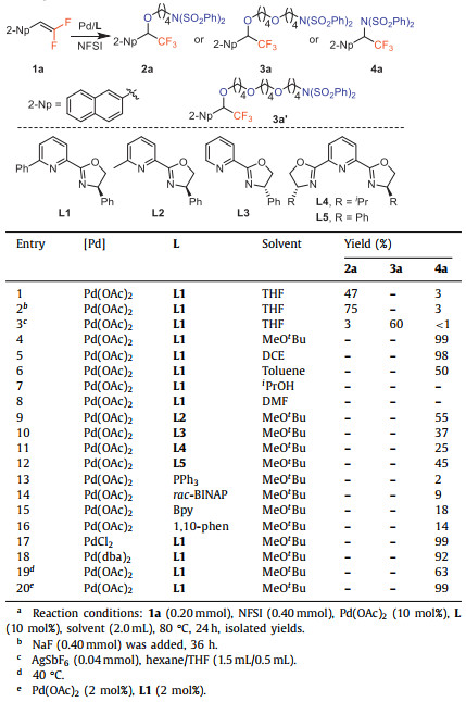 We began our studies by examining the reaction parameters of gem-difluoroalkene 1a and NFSI in the presence of Pd(OAc)2 catalysis (Table 1). We found that the ligand L1 was efficient to give the oxy-aminofluorination product 2a in 47% yield with high chemoselectivity through C(sp3)–O cleavage in THF (entry 1). The yield of 2a could be increased to 75% when NaF was added (entry 2). Very interesting, the more challenged two THF insertion product 3a could be obtained in 60% yield when AgSbF6 was used as an additive (entry 3, for more details see Table S1 in Supporting information). The addition of AgSbF6 might be favored for the coordination of THF to Palladium center and accelerated the succession cleavage of C(sp3)–O bond [59-61]. Trace amount of three THF insertion products observed under the reaction conditions of entry 3 (3a: 3a' = 93:7). We next examined the solvent effect and found that the aminofluorination product 4a was obtained (entries 4–8, for more details see Table S2 in Supporting information). The product 4a could be obtained in 99% yield when MeOtBu was used as solvent at 80 ℃ (entry 4). The DCE gave the comparative result, while DMF and iPrOH gave no desired product (entries 5–8). The ligand structure plays an important role to deliver product 4a (entries 9–16). The PdCl2 and Pd(dba)2 exhibited similar reactivity to the Pd(OAc)2 catalyst (entries 17 and 18). Low yield of 3a was observed when the reaction proceeded at 40 ℃ (entry 19). Furthermore, 4a could be obtained in 99% yield when the Pd catalysis loading decreased to 2 mol% (entry 20). The use of chiral ligands L1-L5 were found with low levels of enantiocontrol (for more details see Tables S4 and S5 in Supporting information).