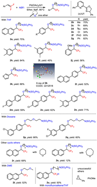 | Scheme 2. Substrate scope of oxy-aminofluorination reaction with one ether insertion. Reaction conditions: 1 (0.20 mmol), NFSI (0.40 mmol), Pd(OAc)2 (10 mol%), L1 (10 mol%), ether (2.0 mL), 80 ℃, 36 h, isolated yields. | |