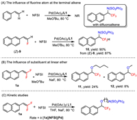 We then performed several experiments to investigate the influence of substituent in the alkene and ether (Scheme 6). When the simple styrene was used, only starting materials were recovered with Pd/L1 catalysis. The reaction worked smoothly for the monofluoroalkene (, affording the α-difluoromethyl benzylic amine products 10 in 90% yield. The monofluoroalkene ( was also successfully converted to 10 in 87% yield. These results indicated the importance of fluorine atom at the alkenes, but irrelevant with the alkene configuration. When methyl n-butyl ether was used instead of cyclic ether, α-trifluoromethyl benzylic ether 11 was obtained in 24% yield and 12 was obtained in 8% yield. This result suggested that the C(sp3)–O cleavage prior occurred at the position with small steric hindrance substituent. When different amount of THF was added in MeOtBu solvent, the THF insertion product was the major product after 50 equiv. THF was added (for more details see Table S3 in Supporting information). Several kinetic studies of the reaction of gem-difluoroalkene 1a, NFSI, [Pd] catalysis and ligand effect by the method of initial rates were performed (Scheme 6C). This reaction exhibited a first-order dependence on the concentration of gem-difluoroalkene 1a, [Pd] catalysis and NFSI (for more details in Supporting information). Notably, these kinetic data are consistent with gem-difluoroalkene into Pd(Ⅱ)–F, but are inconsistent with the Pd(Ⅳ)–F insertion [53,64-66].