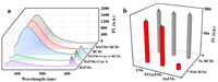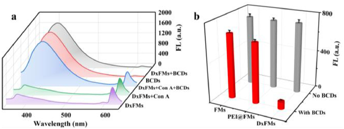 | Fig. 2. (a) The fluorescence emission spectra of BCDs, DxFMs and DxFMs in the presence of Con A or BCDs (λex = 330 nm). (b) The fluorescence emission intensity of FMs, PEI@FMs, DxFMs before and after reaction with BCDs. | |