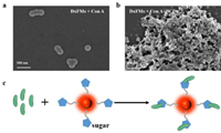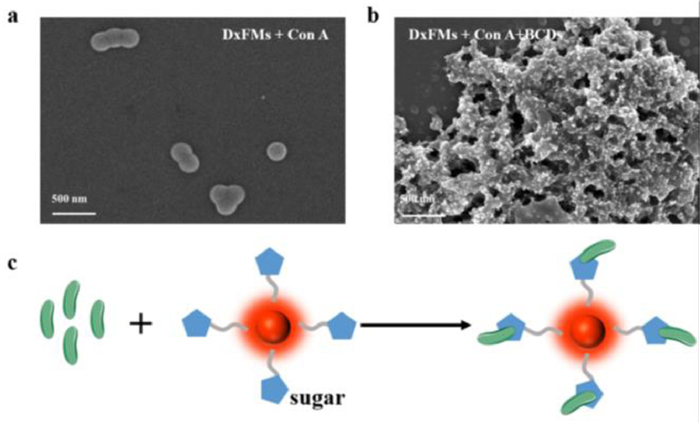 | Fig. 3. The SEM image of DxFMs after reaction with Con A (a) and with BCDs (b), scale bar: 500 nm. (c) The schematic diagram illustrating of DxFM reacting with Con A. | |