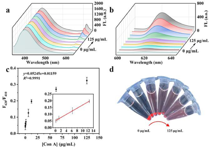 | Fig. 4. (a) The fluorescence emission spectra of DxFMs reacting with different concentrations of Con A. (b) The fluorescence emission spectra of DxFMs reacting with different concentrations of Con A at 600–645 nm. (c) The scatter diagram of F620/F410 corresponding to (a) and the linear relationship between the concentration of Con A and F620/F410. (d) The photo of DxFMs reacting with different concentrations of Con A under ultraviolet lamp (λ = 365 nm). | |
