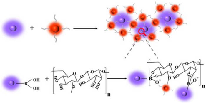 | Scheme 2. Schematic diagram illustrating of the covalent binding between cis-diols of dextran and boronic acid on the surface of BCDs lead to the assembly of BCDs and DxFMs. | |