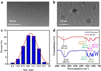 | Fig. 1. Characterization of BCDs. (a) The TEM images of BCDs, scale bar: 50 nm; (b) The TEM images of BCDs, scale bar: 10 nm. (c) The size distribution of BCDs. (d) The FT-IR spectra of BCDs and precursor. | |