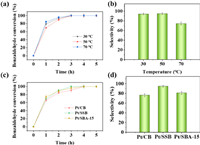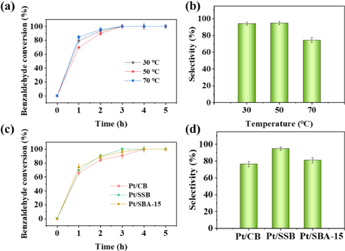 | Fig. 3. The effect of reaction temperature on the (a) benzaldehyde conversion and (b) selectivity of benzyl alcohol at Pt/SSB electrode in the presence of phenol; the effect of electrode on the (c) benzaldehyde conversion and (d) selectivity of benzyl alcohol in the presence of phenol in the ECH system. Except for the influencing factors, other reaction conditions including Pt loading: 1.8 mg/cm2, current: 100 mA, phenol concentration: 15 mmol/L, reaction temperature: 50 ℃, reaction time: 5 h. | |