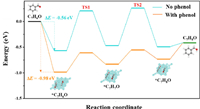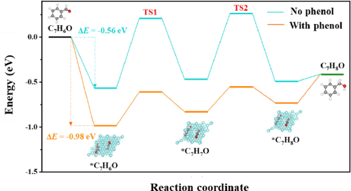 The energy for the stepwise ECH of benzaldehyde on Pt site was calculated in the presence and absence of phenol to further explore the interaction mechanism of ECH of bio-oil model compounds (Fig. 6). The adsorption energy of benzaldehyde was −0.56 eV during ECH of benzaldehyde alone. The adsorption energy expanded to −0.98 eV after phenol was added. Hence, the phenol could enhance the adsorption capacity of benzaldehyde at the active sites dramatically, facilitating the subsequent gradual reduction of benzaldehyde. The energy barriers to be overcome for the stepwise ECH of benzaldehyde with or without phenol on Pt sites were shown in Table 1. Clearly, the energy barrier for the stepwise ECH of benzaldehyde was decreased significantly in the presence of phenol. In detail, the energy required for TS1 and TS2 transition was less than 1/2 of the energy barrier needed for the ECH of benzaldehyde alone. Therefore, phenol can not only promote the adsorption of benzaldehyde, but also facilitate the directional conversion of benzaldehyde on the active site by lowering the reaction energy barrier.