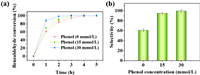 | Fig. 1. The effect of phenol concentration on the (a) benzaldehyde conversion and (b) selectivity of benzyl alcohol at Pt/SSB electrode. Pt loading: 1.8 mg/cm2, current: 100 mA, reaction temperature: 50 ℃, reaction time: 5 h. | |