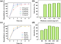 | Fig. 2. The effect of Pt loading on the (a) benzaldehyde conversion and (b) selectivity of benzyl alcohol at Pt/SSB electrode in the presence of phenol; the effect of current on the (c) benzaldehyde conversion and (d) selectivity of benzyl alcohol at Pt/SSB electrode in the presence of phenol. Except for the influencing factors, other reaction conditions including Pt loading: 1.8 mg/cm2, current: 100 mA, phenol concentration: 15 mmol/L, reaction temperature: 50 ℃, reaction time: 5 h. | |