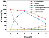 | Fig. 4. Content changes of phenol, benzaldehyde and their ECH products. Electrode: Pt/SSB, Pt loading: 1.8 mg/cm2, current: 100 mA, reaction temperature: 50 ℃, reaction time: 10 h. | |